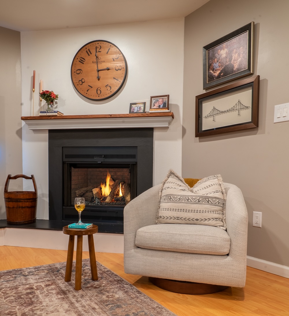 The living room underwent one of the most dramatic transformations in the entire project. The original space was functional but felt dark, sparse, and disconnected, with furniture floating in the room and little architectural interest to anchor it. The lighting was limited, the layout lacked purpose, and the fireplace wall had potential that had never been fully realized.
